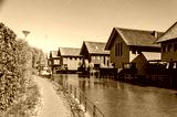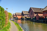 Harmelen, The Netherlands, April 12, 2025: path along a watercourse with a group of wooden houses on stilts on the opposite side of the water