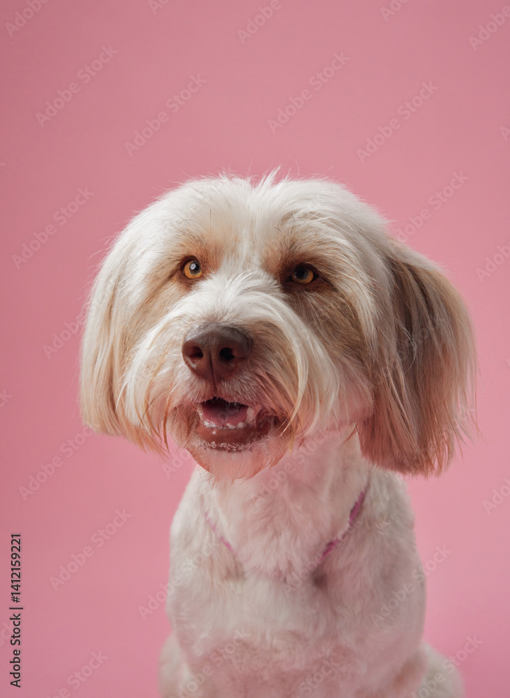 A calm white dog sits peacefully in a minimalistic pink studio setup. The soft lighting draws attention to its relaxed posture and fluffy, well-groomed coat.