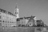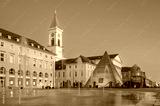 Karlsruhe Marktplatz features pyramid structure and fountain display during twilight hours