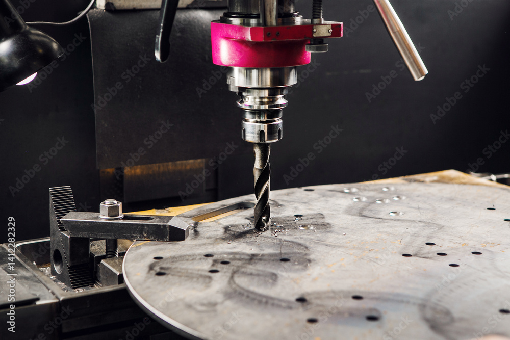 Vertical drill makes holes in metal part. Close-up of metal drilling machine.