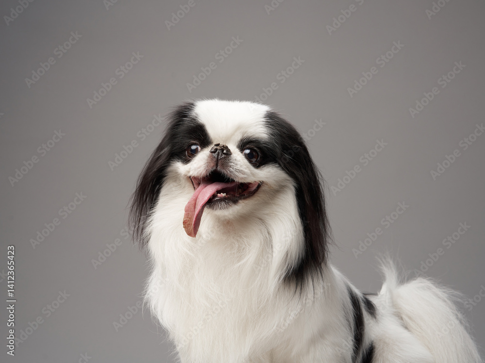 A Japanese Chin is captured smiling in a studio with a white backdrop. The dog's bright expression and silky coat are highlighted by soft lighting.