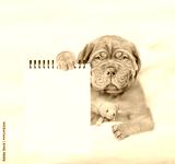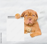 Tired Mastiff puppy sleeps on a bed at home and showing empty list in it paw. Top down view. Empty space for text