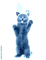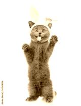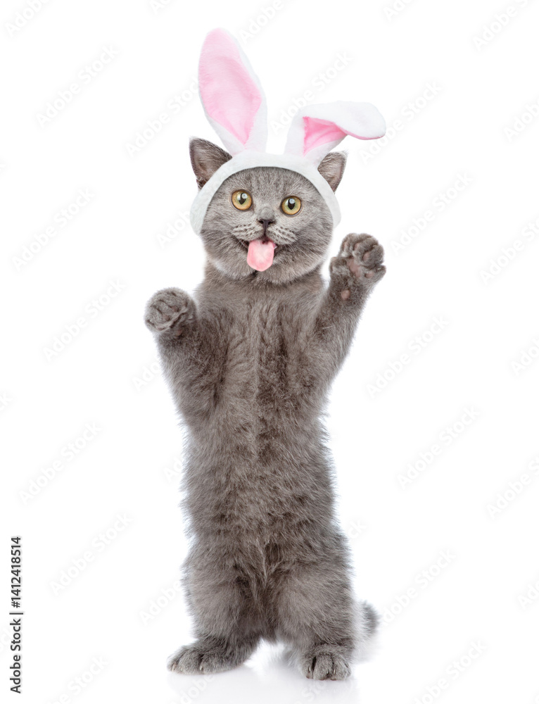 Funny cat with tongue out wearing easter rabbits ears stands on hind legs. Isolated on white background