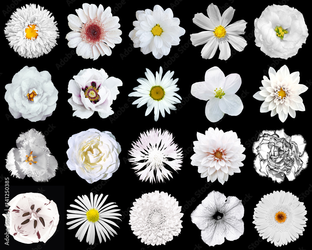Mega pack of natural and surreal white flowers 20 in 1 isolated on black