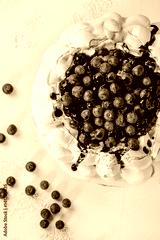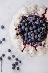 Homemade meringue cake Pavlova with whipped cream, fresh blueberries and blueberry sauce on vintage cake stand on white concrete texture background