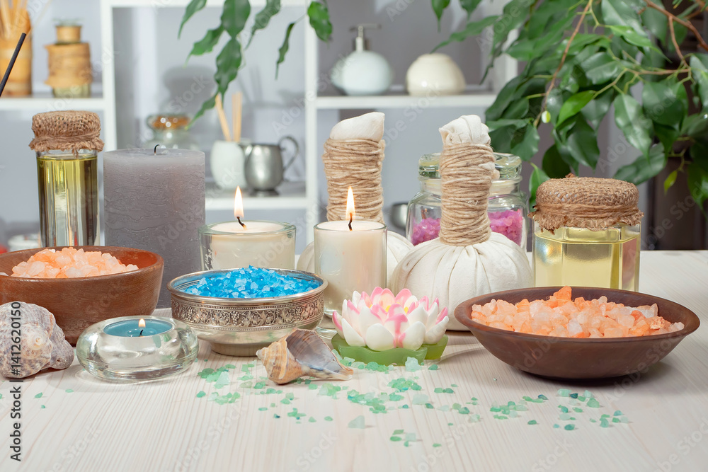 Spa massage items are arranged in a composition on the table.