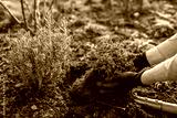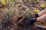 Transplanting catmint in spring garden using shovel digging clump out. Gardener planting bare root nepeta in soil