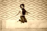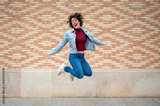 Young woman jumping with joy in urban setting expressing happiness and freedom