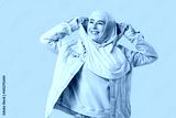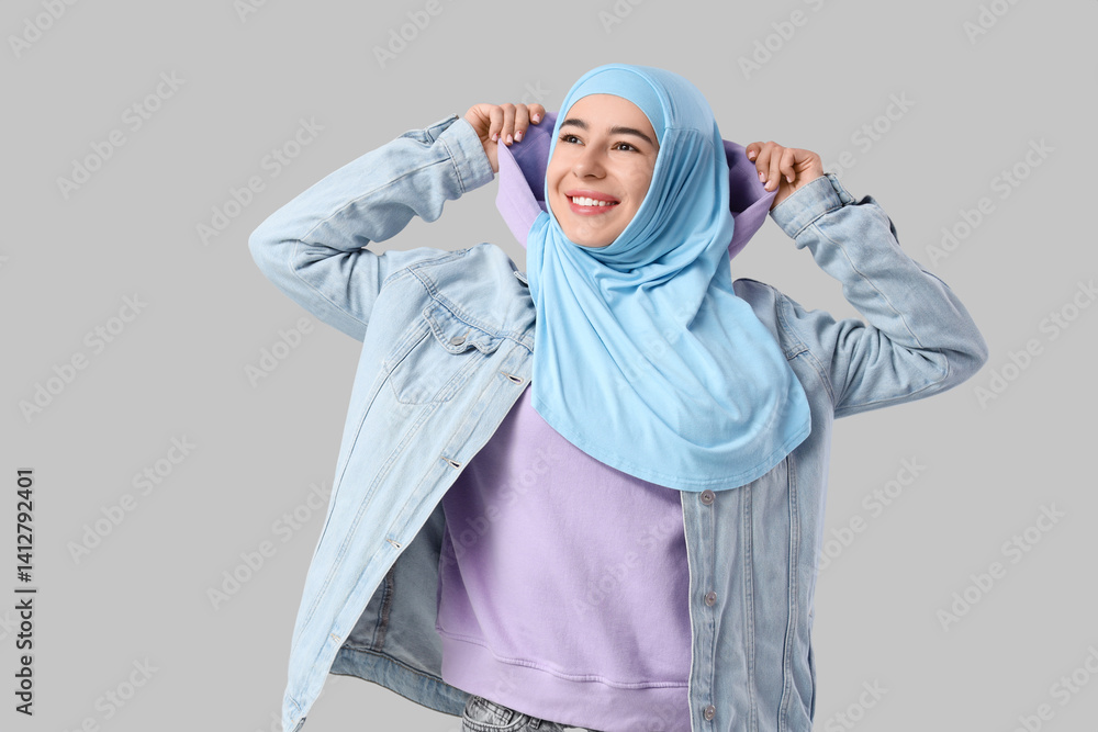 Happy young Muslim woman in hijab on grey background