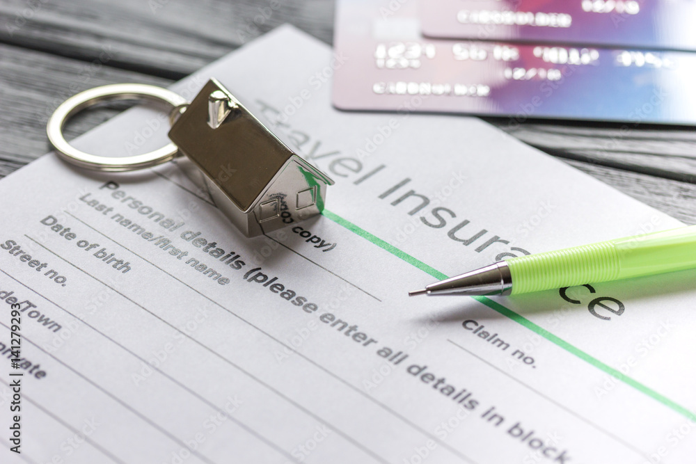 Traveling concept with insurance application on wooden table