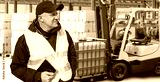Warehouse worker in a safety vest stands near stacked boxes and a forklift, holding a tablet for inventory control. - Warehouse, Logistics.