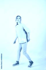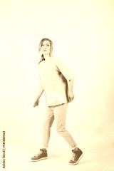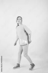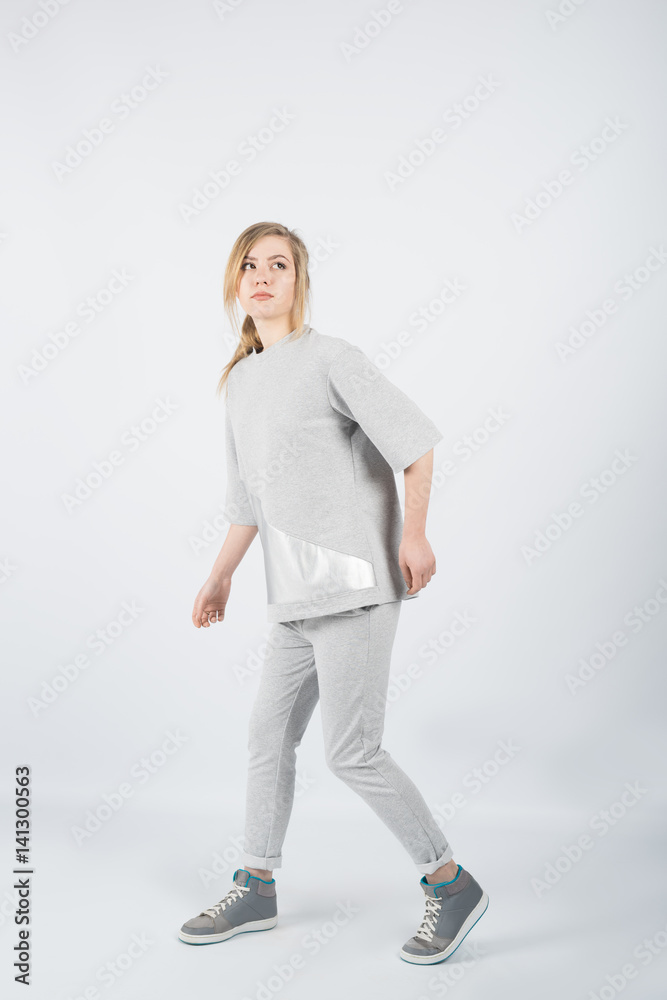 Young beautiful girl wearing grey clothes and sneakers posing isolated on white background