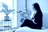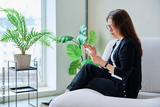 Anxious nervous middle aged woman looking at smartphone sitting on sofa