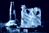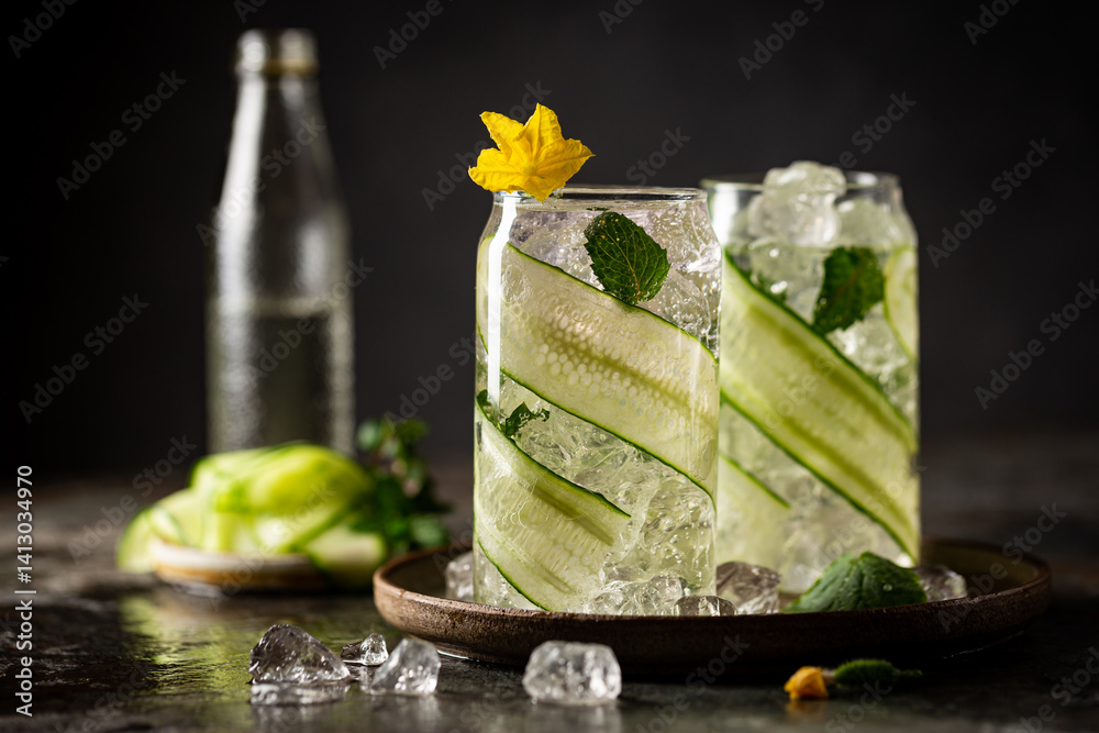 Cucumber infused detox water with mint in a glass with ice. Homemade flavored lemonade on dark background