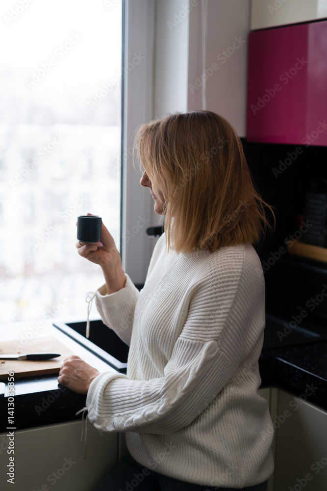 Beautiful young woman enjoying morning in the kitchen holding a cup of coffee in her hands