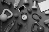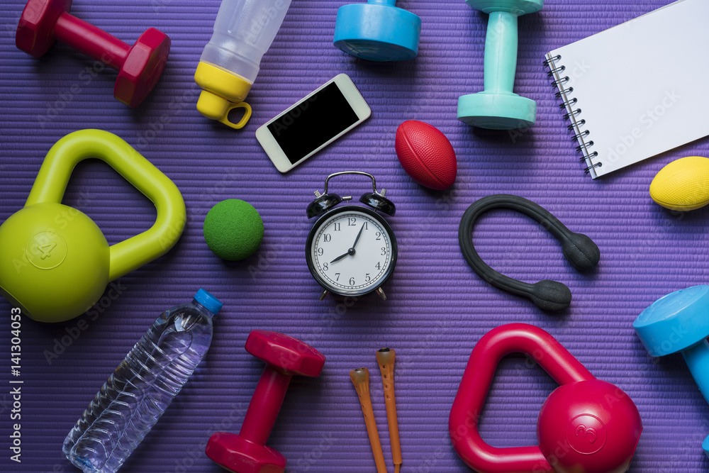 Time for exercising clock and sport equipment with yoga mat background