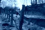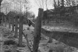 A fence made of wood and concrete in the countryside separating a farm from the road. Wooden fence posts are set in snowy ground, connected by horizontal wooden beams. Sparse grass patches .