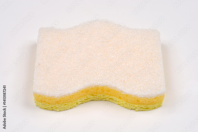 A white and yellow layered sponge with a curved bottom edge is shown against a plain background