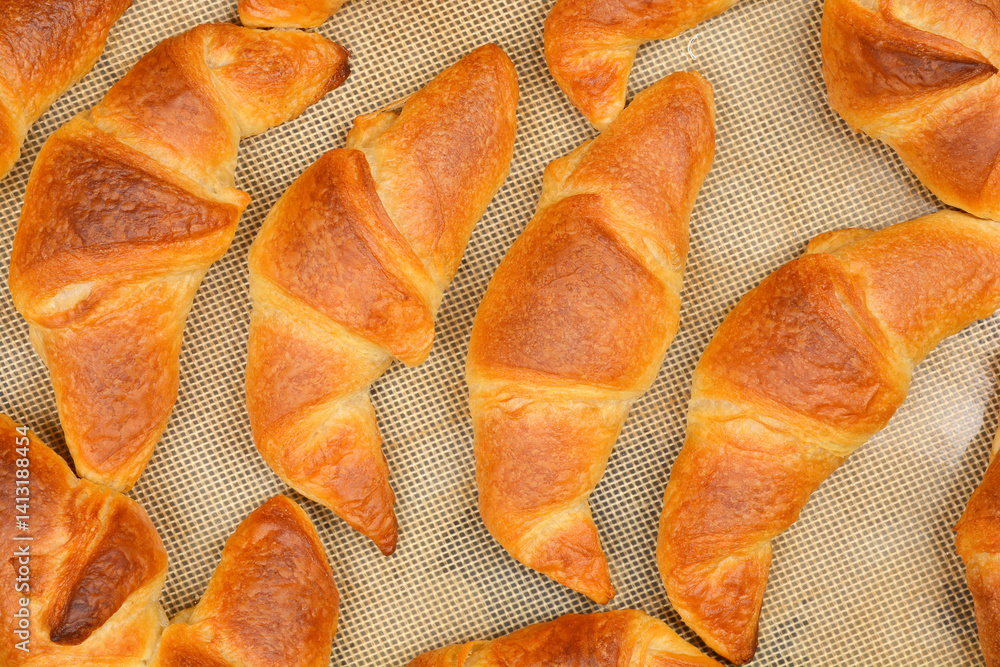 An overhead shot shows freshly baked golden brown croissants arranged on a baking mat