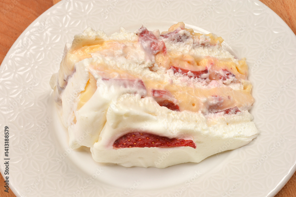A slice of Frozen wind cake (layered meringue cake with whipped cream and fruit) is presented on a white ornate plate