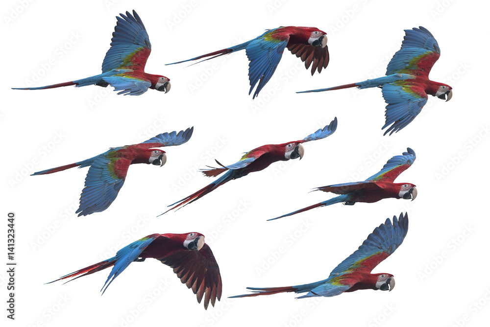 Set of macaw flying , Beautiful red and green macaw isolated on white background