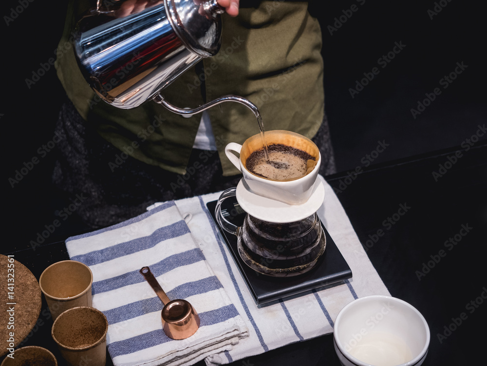 Hand Drip Coffee Barista pouring water on coffee ground with filter