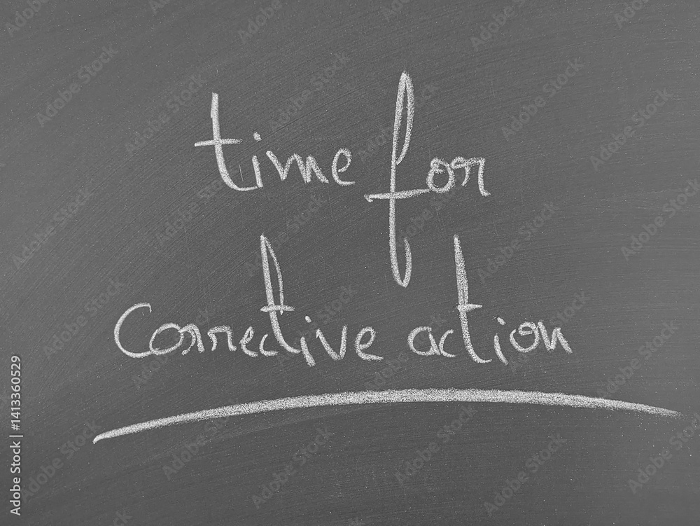 Chalkboard inscription: a call for "time for corrective action", hinting at the necessity for improvement and immediate measures.