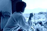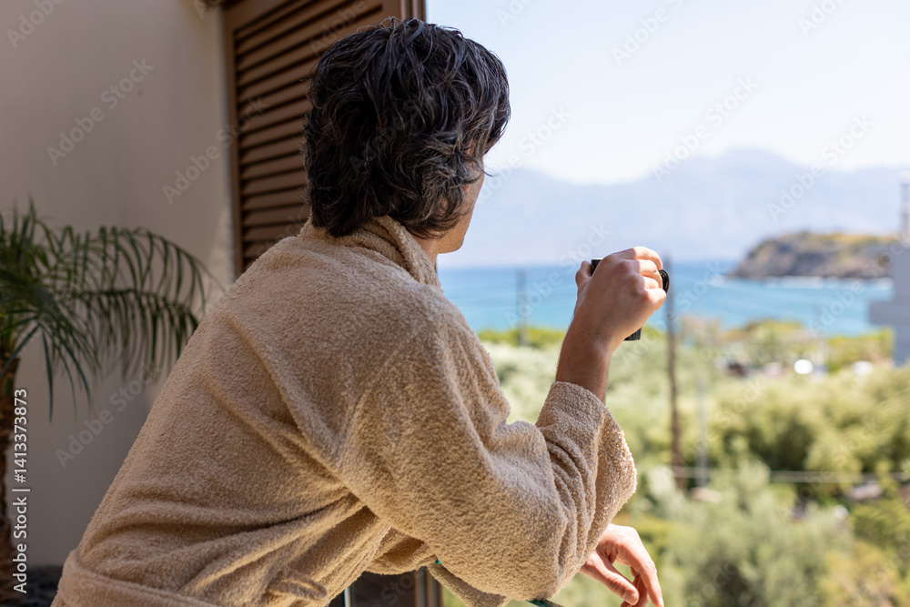Man in a beige bathrobe enjoying a cup of coffee on a balcony with a scenic sea and mountain view.