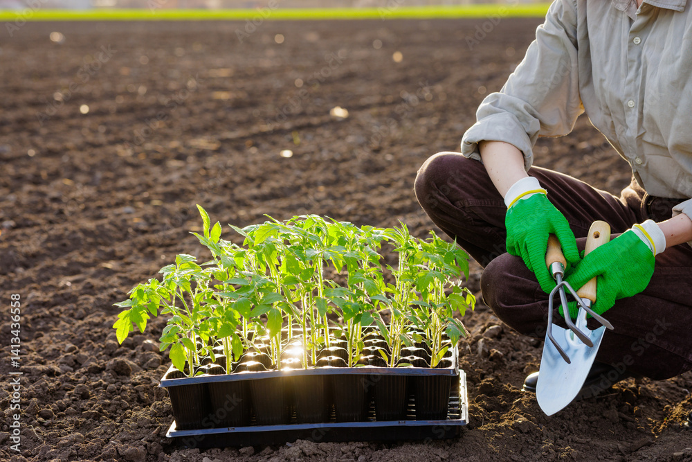 Person with gardening gloves and tools near tomato seedlings, ready for planting in soil.