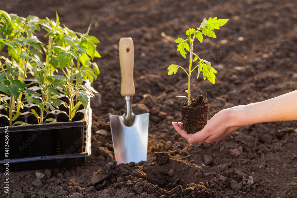 Tomato seedling held by hand, prepared for planting with gardening tools in fresh soil outdoors.
