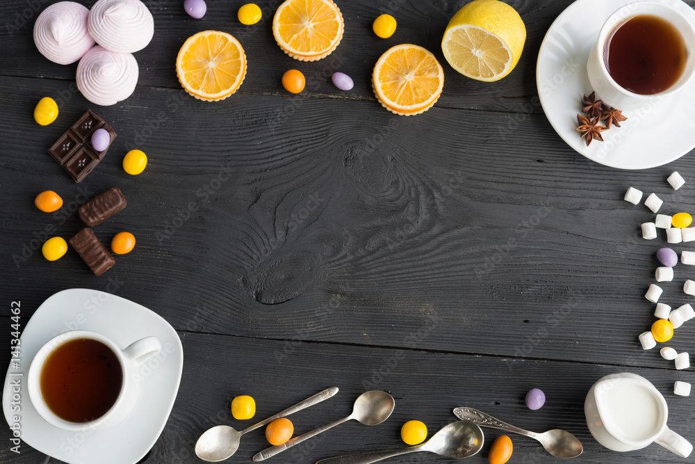 An assortment tea, coffee, marshmallow, chocolate and orange.