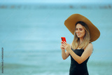 Woman Looking at Mobile Phone at Seaside Checking Weather. Person can not be separated from technology even on vacation