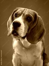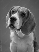 A close-up portrait of a beagle with its head slightly tilted, emphasizing its curiosity. The soft lighting highlights the dog's deep eyes and fur texture.