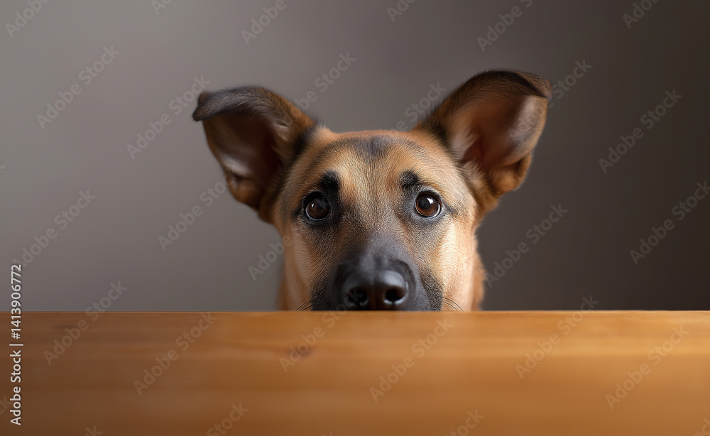 Dog with big ears peeking over a wooden table with a curious and slightly sad expression.