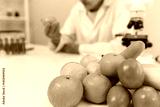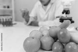 Scientist check chemical food residues in laboratory. Control experts inspect quality of fruits, vegetables. lab, hazards, ROHs, find prohibited substances, contaminate, Microscope, Microbiologis