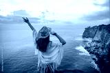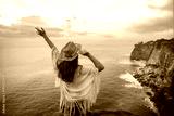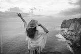Happy free traveler girl wearing hat with open arms enjoys turquoise stunning ocean view on cliff during traveling at beautiful destination on Bali island, Indonesia
