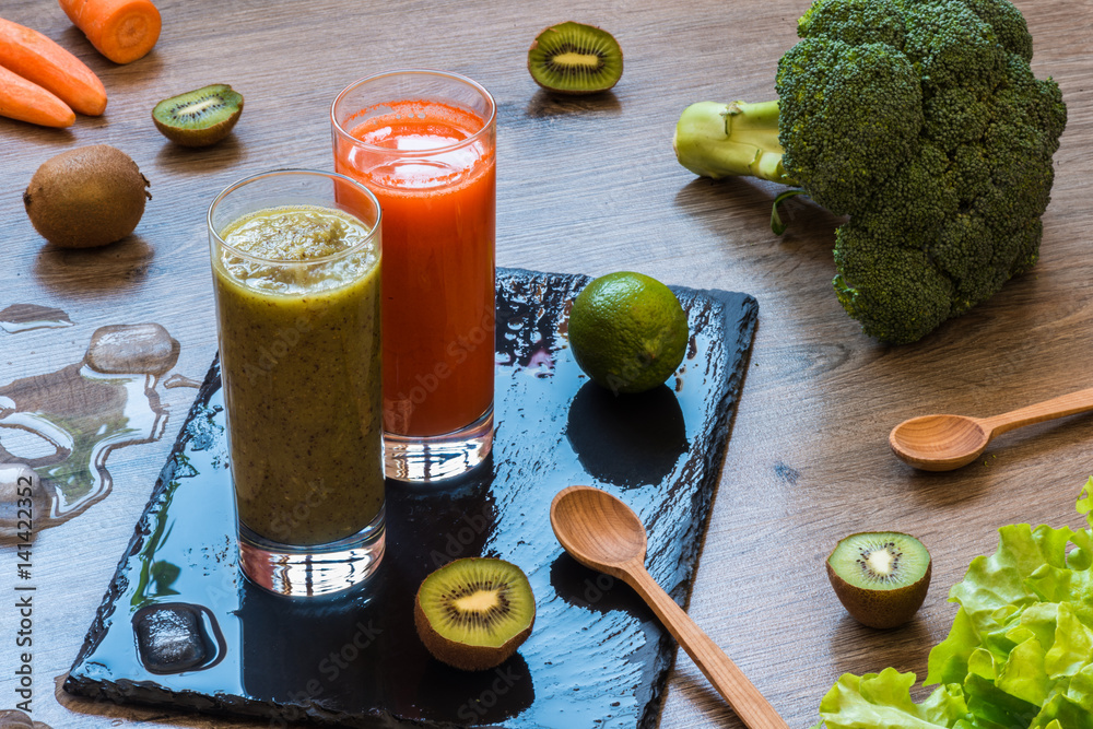 Detox diet. Healthy eating. Kiwi and carrot fresh juices.
