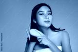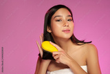 Young woman brushes her hair against a vibrant pink background during a beauty routine at home