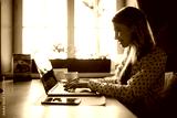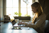 Side portrait of beautiful blonde woman sitting at cafe using laptop
