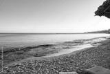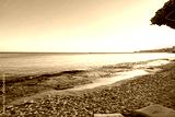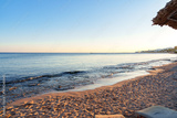 Serene beach at sunset with gentle waves and a tranquil atmosphere near coastal town