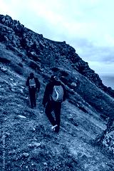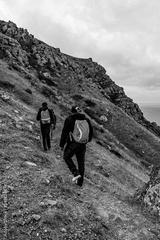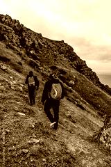 Hikers navigate rocky terrain on a cloudy day near the coast, embracing nature's beauty and adventure in a remote area