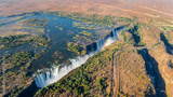 Victoria Falls with the bridge, aerial view from helicopter, Zimbabwe, Zambia