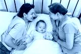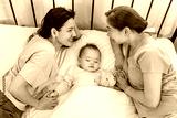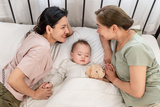 Asian lesbian couple lovingly caring for and raising their baby boy at home.