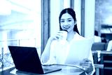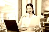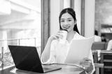 Young woman enjoying coffee while working on laptop and reviewing paperwork at cafe table