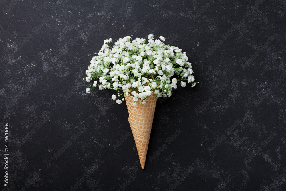 Ice cream of gypsophila flowers in waffle cone on black table top view in flat lay style.