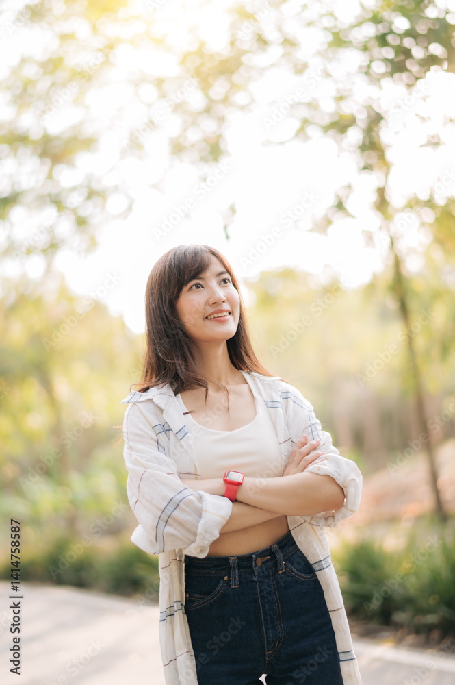 Asian woman enjoying summer outdoors, breathing fresh air with cheerful smile, wearing casual clothes in serene natural park setting