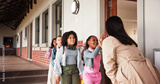 Teacher, children and happy with high five at classroom, queue and motivation for learning at school. Person, kids and mentor with welcome, smile and support with greeting in morning at academy
