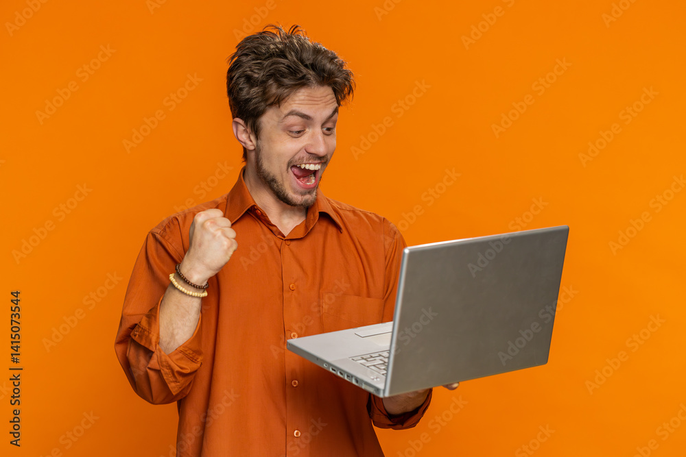Happy excited Caucasian man typing on laptop, working on project, enjoying results, winning lottery game celebrating success, online shopping victory good email news. Bearded guy on orange background
