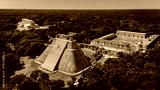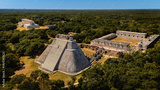 Aerial view of the Mayan archaeological site Uxmal with Magician's Pyramid in the foreground and surrounded by jungle in Mexico