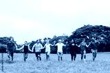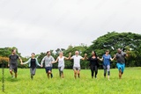 Group of diverse adults holding hands, running in a park. Men and women enjoying outdoor activity, smiling, and having fun together. Happy people in community holding hands. Environmentalist in nature